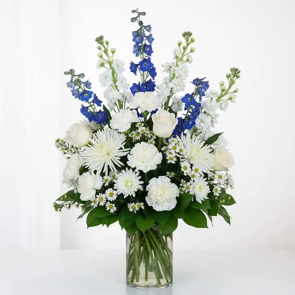 Experience the tranquil beauty of our Azure Sky arrangement, a stunning blend of white roses, stock, and poms, accented with vibrant blue delphinium. This elegant bouquet brings a breath of fresh air and peaceful charm to any space. It's the perfect way to uplift spirits and brighten a day. Products of the same value may be substituted if the ones pictured are not available.